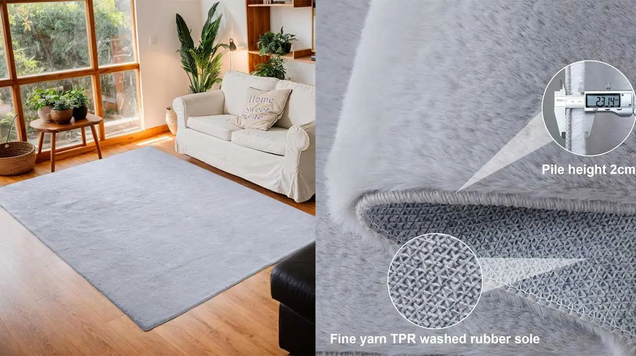 Esta alfombra está fabricada con felpa gruesa de imitación a piel de conejo de alta calidad, lo que le aporta una textura suave y ligera, perfecta para caminar descalzo con total comodidad. Además, es agradable al tacto, inodora y resistente al desgaste, por lo que no se cae fácilmente ni pierde su color con el tiempo.
