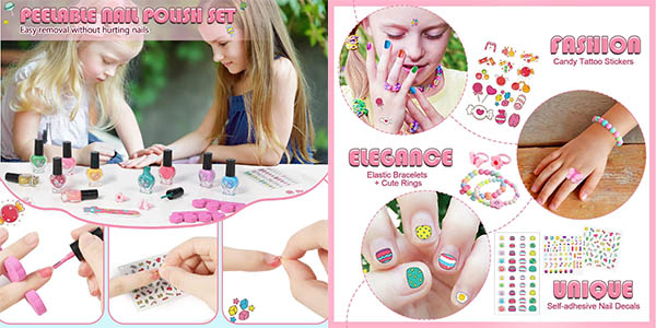 Estás así ante un kit de manicura infantil barato con un total de 23 piezas entre las que se incluyen 10 esmaltes de colores para las uñas cuya fórmula no tóxica a base de agua no requiere de ningún producto especial para eliminarlo. ¡Tan solo rascando lo desprenderás su capa de pintura sin que los peques tengan que utilizar químicos nocivos!