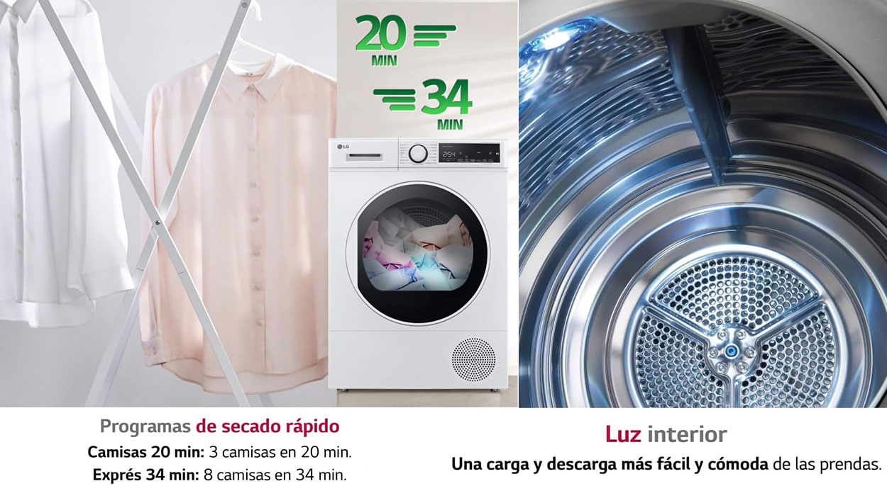 En este sentido, incluye opciones de secado rápido para 3 camisas en sólo 20 minutos y un ciclo exprés de 34 minutos para hasta 8 camisas, y gracias a su luz interior, cargar y descargar se vuelve una tarea sencilla y cómoda. Además, su sistema de giro bidireccional mezcla la ropa de forma uniforme, logrando un secado óptimo en cada carga.