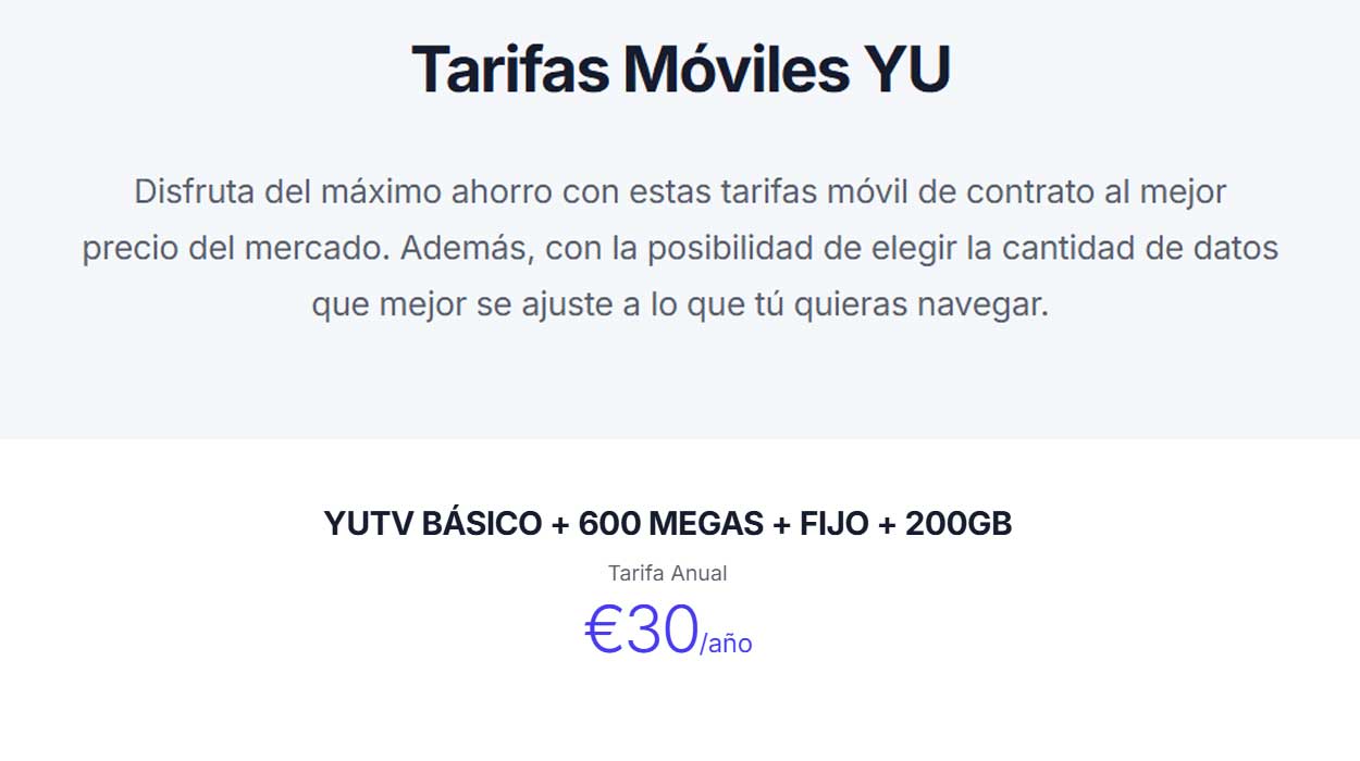 Asegura tu tarifa de YU Telecom por solo 30€ al año haciendo clic aquí y disfruta de fibra, TV, fijo y móvil con el mejor precio del mercado.